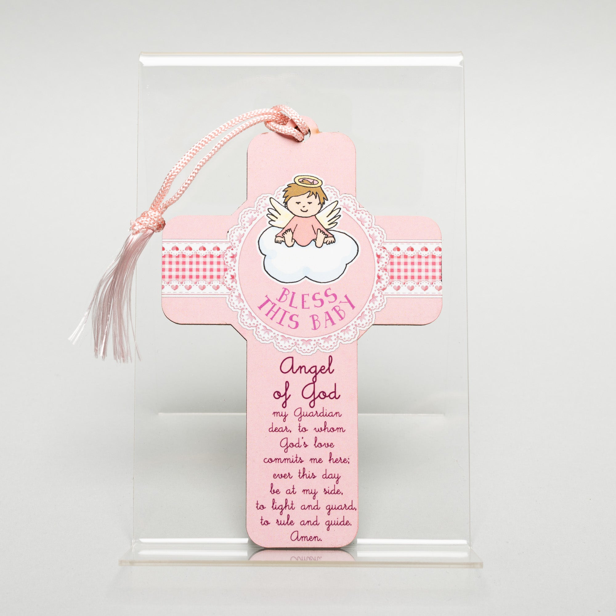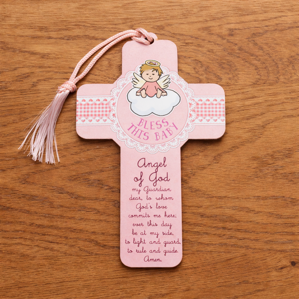 A charming wooden Guardian Angel cross, thoughtfully designed as a Christening, baptism, or newborn gift. Featuring a sweet angel illustration, the words “Bless This Baby”, and the traditional Angel of God prayer, this cross makes a beautiful keepsake to treasure for years to come.